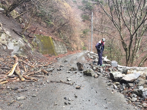 道路に広がる土砂崩れも危険だと感じ、入渓点まで行けず安全第一を考え入渓を断念。