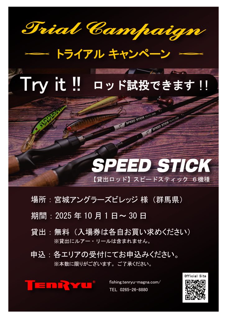 エリアトライアルキャンペーン開催中! イベント X Facebook はてブ Pocket LINE コピー 2025.10.03 10月1日から30日まで、群馬県の『宮城アングラーズヴィレッジ』様にてスピードスティック全6機種を展示🎣 クラシックなアクションを「超低弾性カーボン」という現代的な素材にて再現した本モデル。 TENRYU独自のアクションを是非、お試しください。