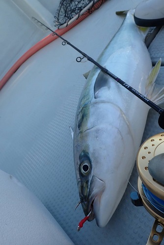 開始早々に試作ロッドで景気よく6kg前後のハマチを上げ、