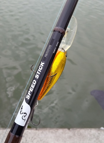 今度は乗りの良いロッド #2-266B に変えて、再度護岸を擦るようにクランクを通します。