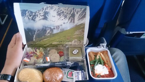 エアロフロートの機内食、山の写真でテンションが上がる、