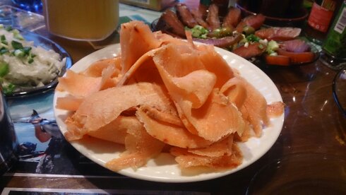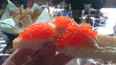 朝食時、みなさんパンにバターをぬりその上にイクラをのせて食べている