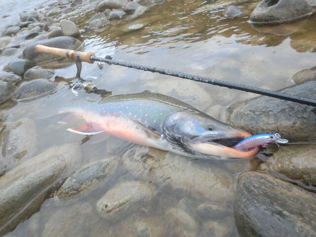 ロッジ前の中洲でミノーをトゥイッチさせると良型のガリエツが掛かった。