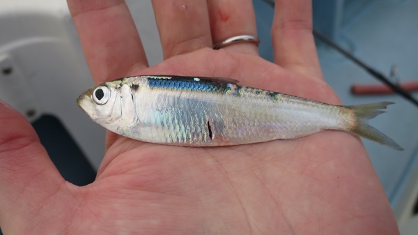 小型の魚がスレ掛かりしており、正体はサッパ。これがベイトなのか?