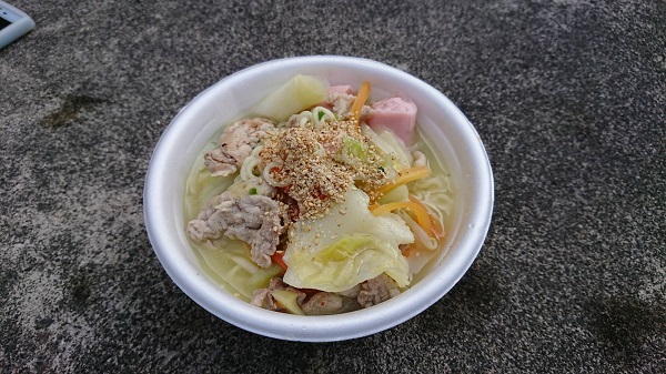 湖畔でタンメンをご馳走になりました。下界で食べる味覚より1.5倍はアップします。