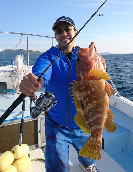 80g前後のスロー系のジグで良型のアコウを早速キャッチ。