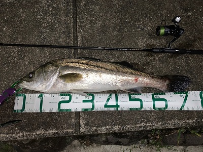 エイかなとも思ったのですが、ランカー並みのシーバスの引きだと確信して強くフッキングして