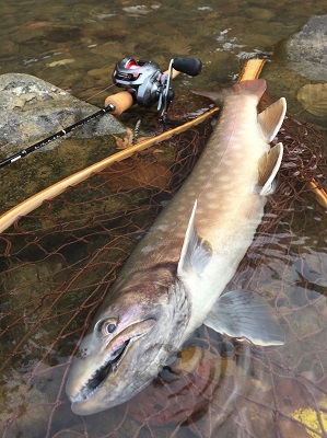 大型遡上魚の強烈なバイトに柔らかく追従するティップ。