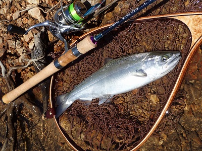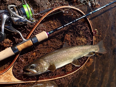 写真は、数少ないアタリを掛けたイワナとアマゴ。