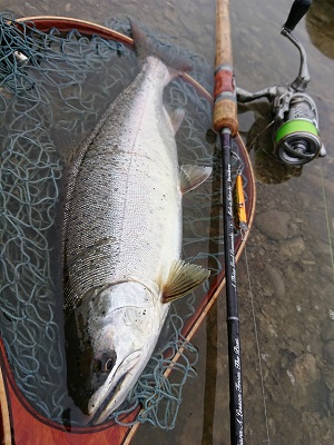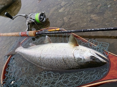 RZS71MLの柔軟なティップがヤマメの首振り、突っ込みを吸収してくれたおかげで