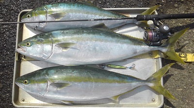 鯛狙いのジギングでしたが、ワラサが活発で次々に当たってきました。