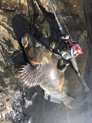 丁寧にワームを送り、雌特有のバイトを合わせて磯際から強引に魚を抜くと54㎝のランカーサイズ!