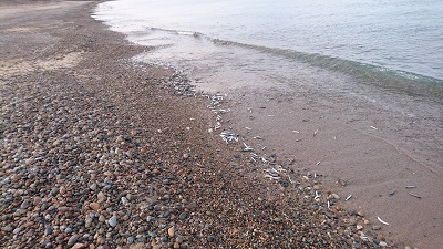 あかるくなりかけた頃、イワシの群れが岸際を泳いでいました