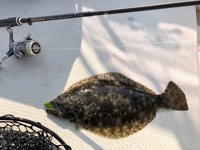 潮目を探っていたら、ゴツンと当たりました。ヒラメが釣れる季節到来です。