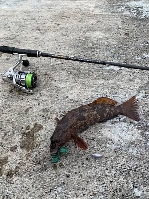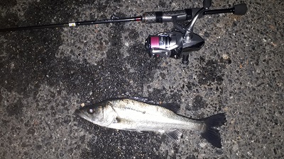 着水すぐにてアジングワームをリーリングしていると、シーバスがヒット!