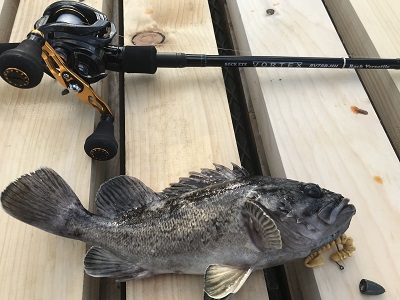磯ロック用に購入しましたが、ファーストフィッシュは漁港の岩場でクロソイでした。