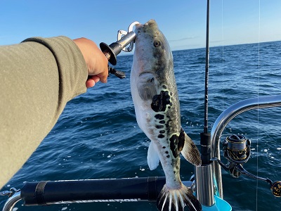真鯛狙いで出船しましたが、ファーストフィッシュで虎河豚がメタルジグ(40g)で上がりました。