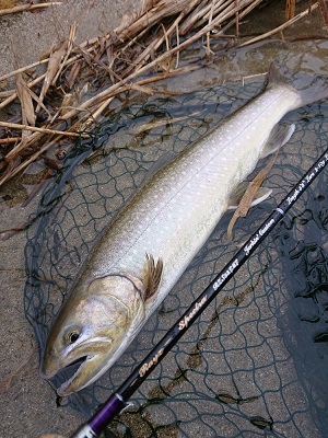 まだまだ冬の名残が強くミノーでは食いきれないようでスプーンのリフト&フォールでキャッチ。