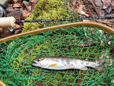 山岳渓流で小さいながらコンディション抜群の越冬アマゴと出会いました。