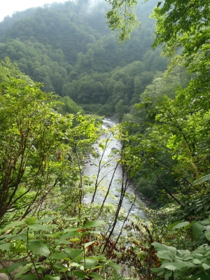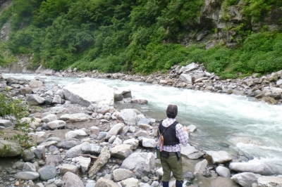 草木が生い茂った場崖を、ロープを駆使して川へ降りた。