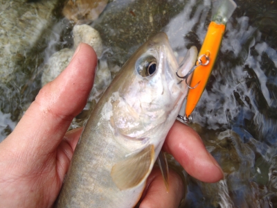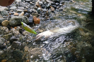 ミノーを結んで、オーバーハングした木々の隙間を射っていく。
