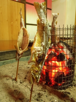 晩は囲炉裏を囲んで、釣り上げた獲物を食す。