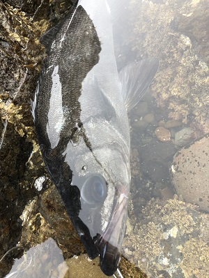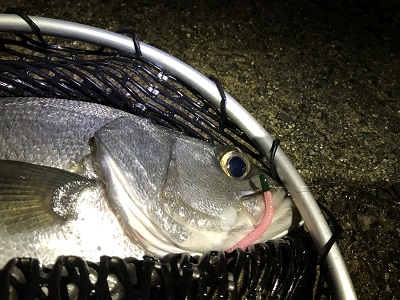 まだ暗い早朝四時ごろ。あれ、これヒラかもしれない…と上がってきたヒラスズキ。